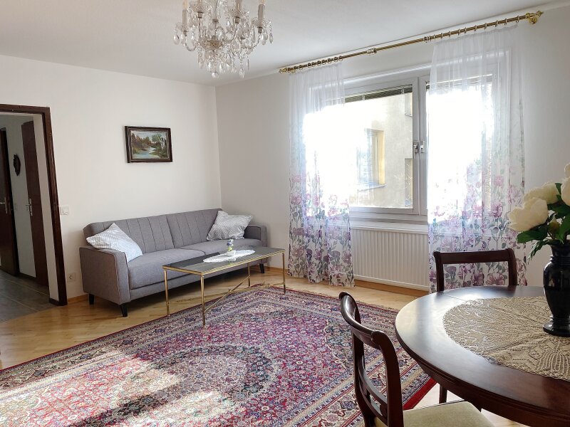 Es erwartet Sie eine sehr gepflegte Wohnung mit allem Komfort: Modernes Bad, qualitätsvolle Möbel, geräumige Zimmer, neue Kästen & viel Stauraum, alle Geräte von Waschmaschine bis hin zum Staubsauger. / 1 bedroom, 1 living room, kitchen fully equipped, storage room, a bathroom & toilet and entrance.
